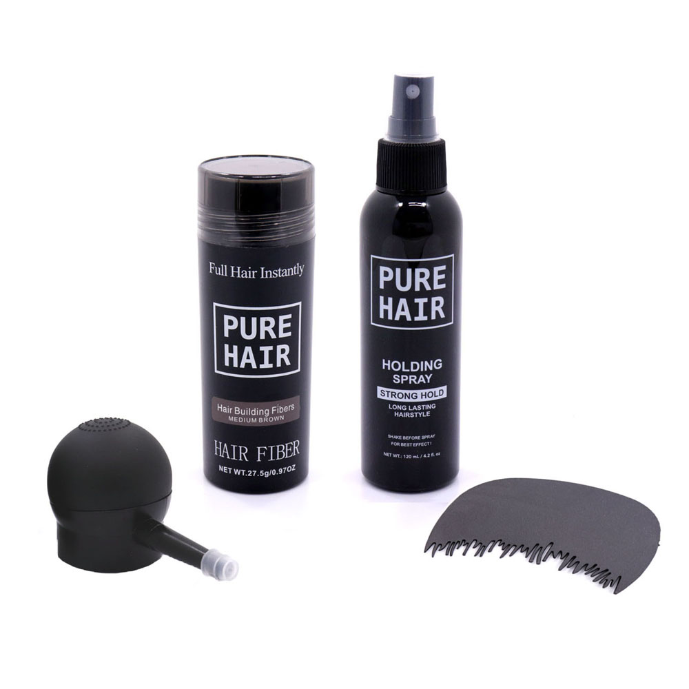 Pure Hair haarvezels zijn simpel gezegd Medium Bruine haarvezels in een potje. Deze vezels zijn gemaakt van keratine eiwit en zijn natuurlijk product. Door het potje over het dunner wordende haar te schudden, mengen zich binnen enkele seconden de minuscule haarvezels zich met je eigen haar.